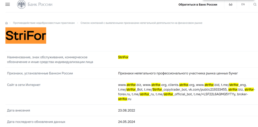 Проверить Strifor на сайте Банка России